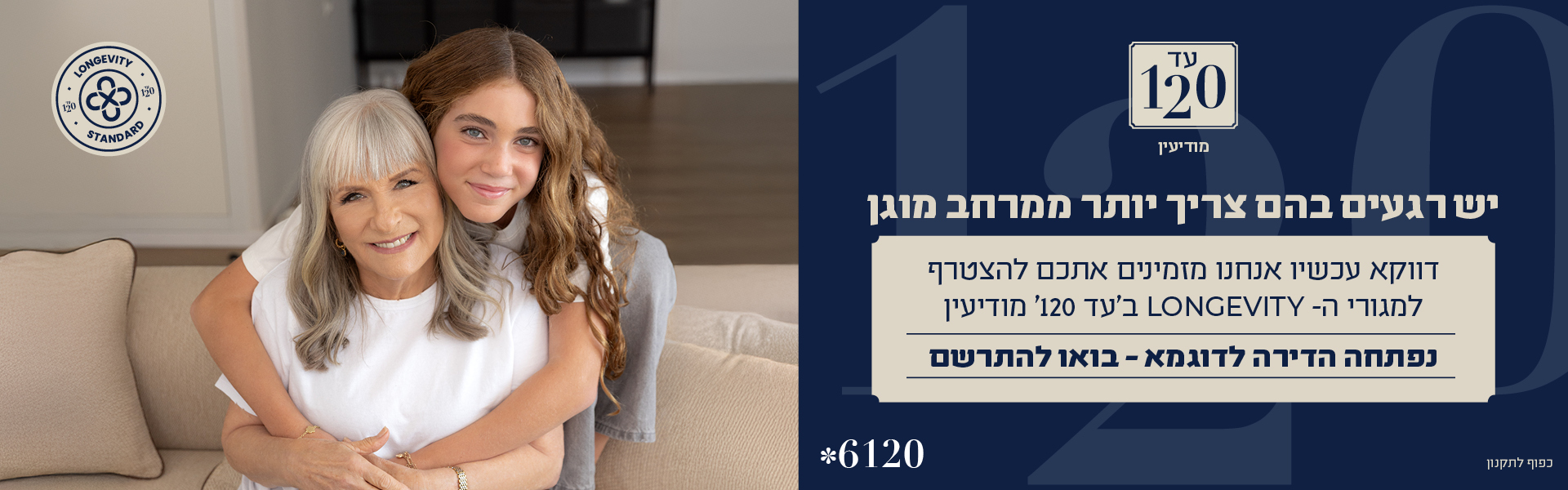 עד 120 מודיעין, אשר עתיד להיות מאוכלס בשנת 2026, מציג קונספט מגורים חדשני בתחום הדיור מוגן במודיעין. חוויה השואבת השראה ממלונות הבוטיק המתקדמים בעולם בגרסה חמה וביתית. זאת, בכדי להעצים את חווית המגורים ותחושת הבריאות הגופנית והמנטלית של דיירי הבית. במילים אחרות, לגרום לדיירי הבית לחיות ולהרגיש אחרת. דיור מוגן לגיל השלישי ב"עד 120" ממוקם במרכז העיר מודיעין, קרוב לכל מקום.